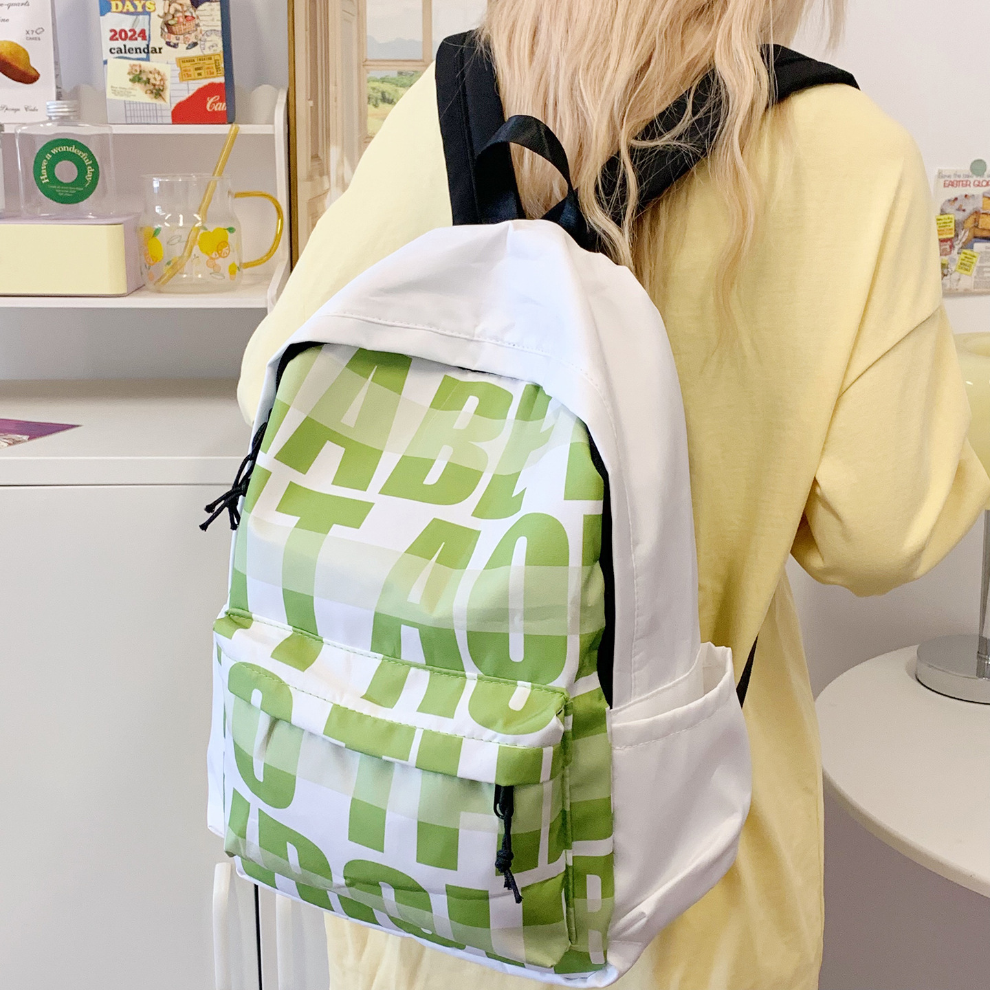 休闲背包外贸新款大容量潮流卡通尼龙背包韩版时尚格纹百搭双肩包