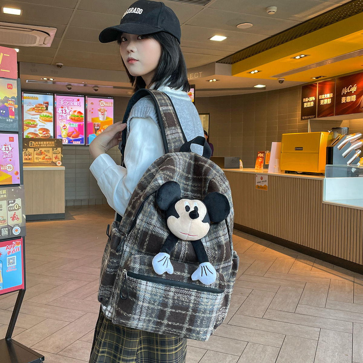 2025新款韩系格子高颜值可爱毛绒卡通大容量双肩包