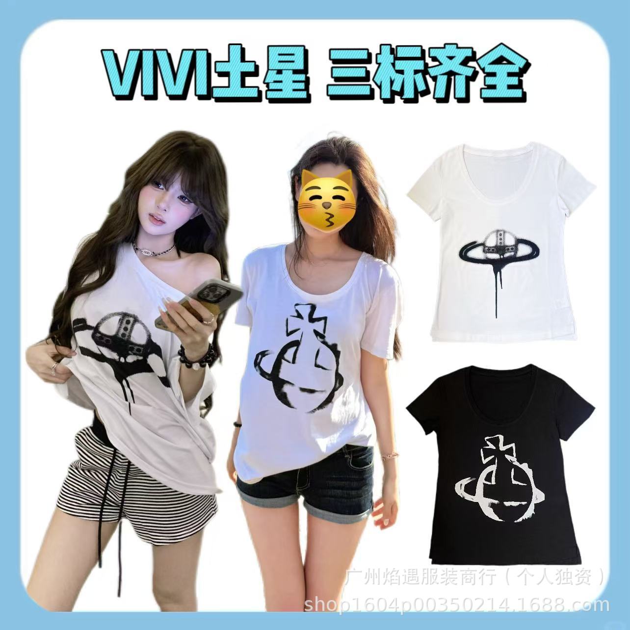 VIVI土星印花低领上衣U领辣妹短袖收腰显瘦简约上衣女夏一件代发