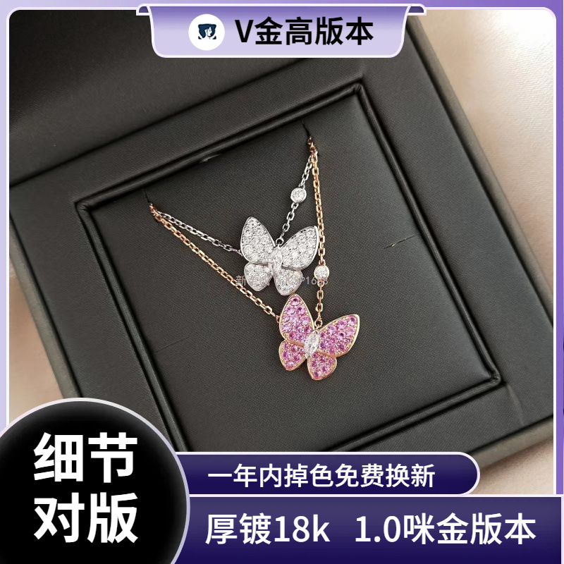 高版本V金CNC满钻蝴蝶项链女镀18k玫瑰金粉钻吊坠四叶草锁骨链