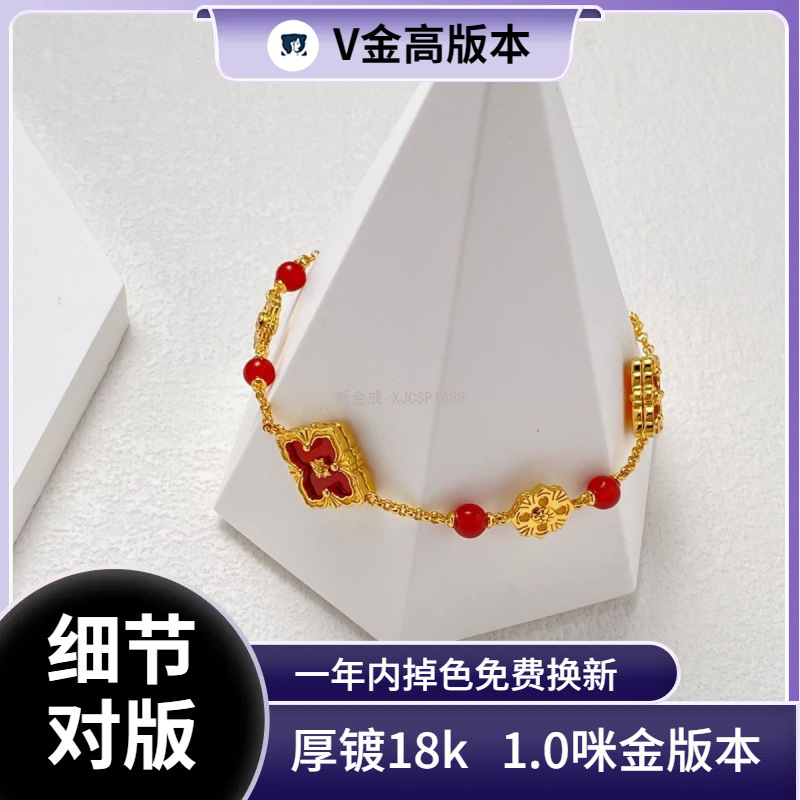 拉丝迷你小号四叶草玉髓珠子红珐琅三花手链百搭潮流厂家批发V金