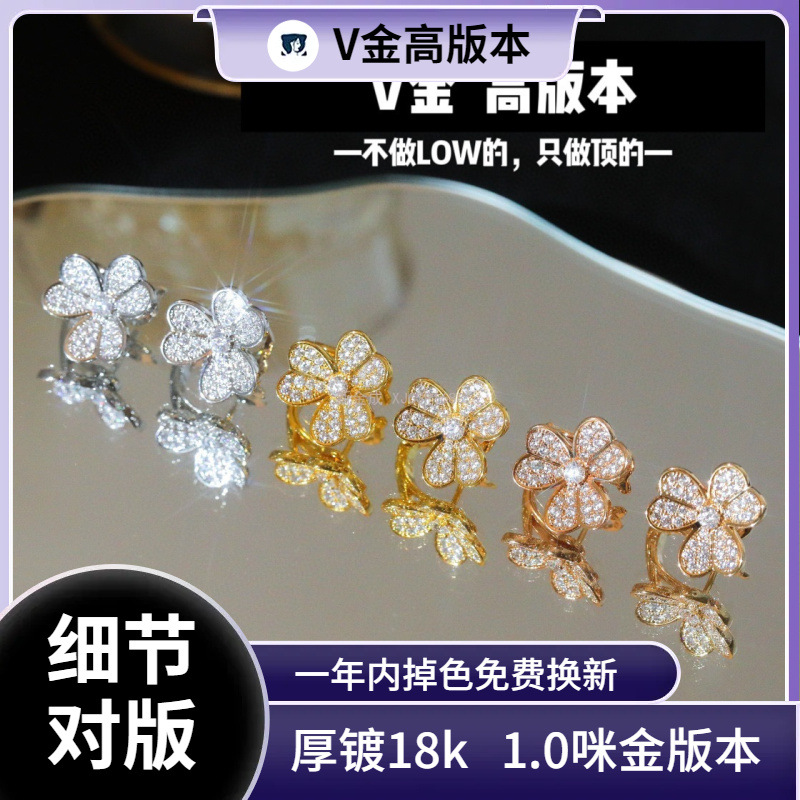 V金高版本三叶草满钻镶嵌流苏耳环夹拍耳钉厚镀18K玫瑰金四叶草