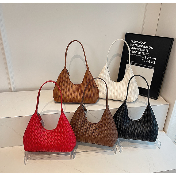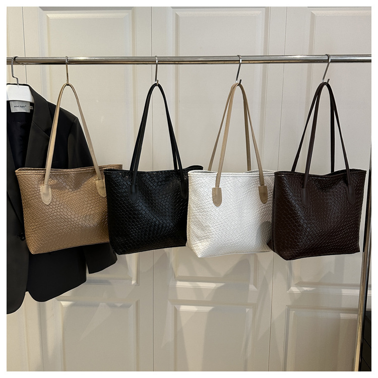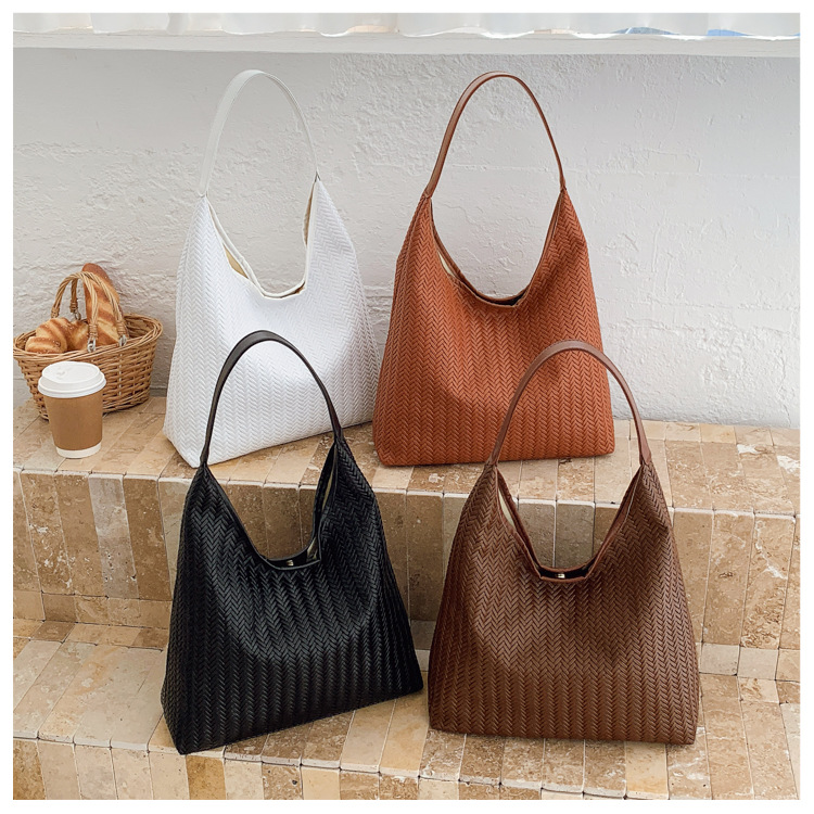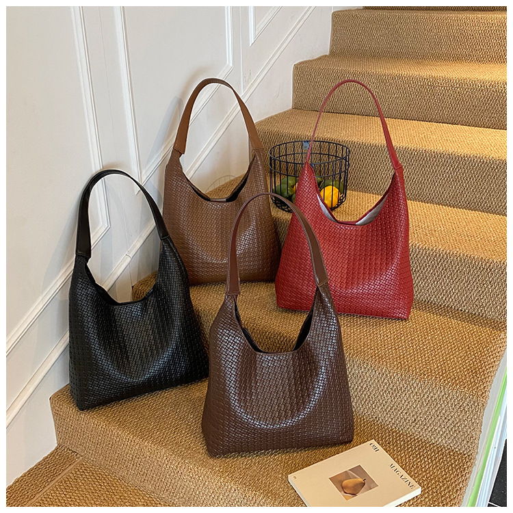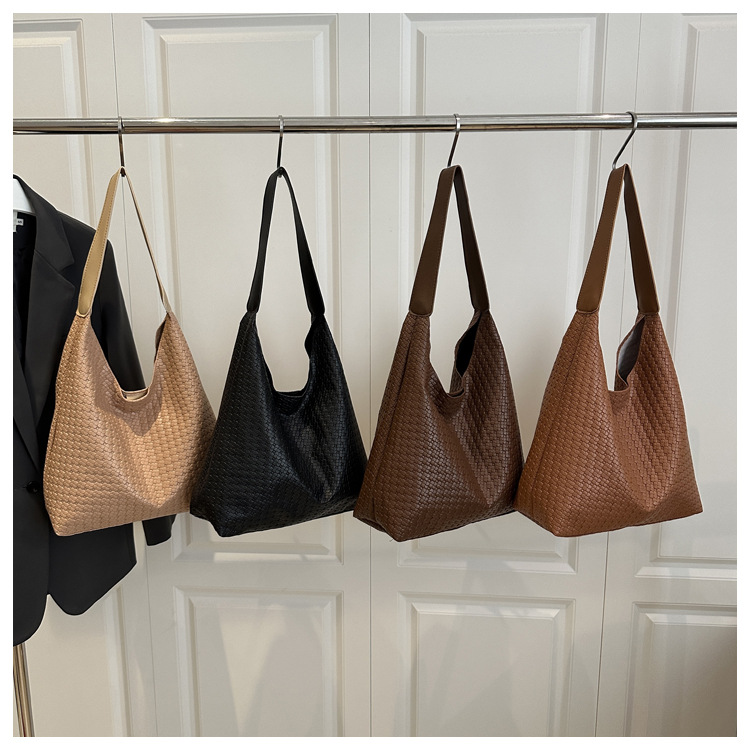 2025跨境女包大容量纯色单肩包流行百搭外贸批发编织纹腋下水桶包