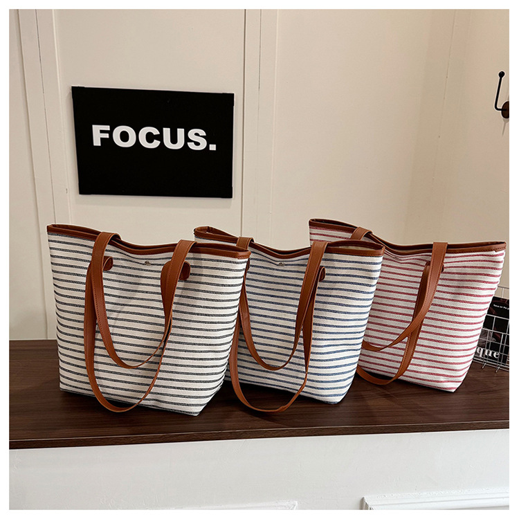 跨境2025新款韩系小众大容量条纹托特包高级慵懒时尚通勤帆布包