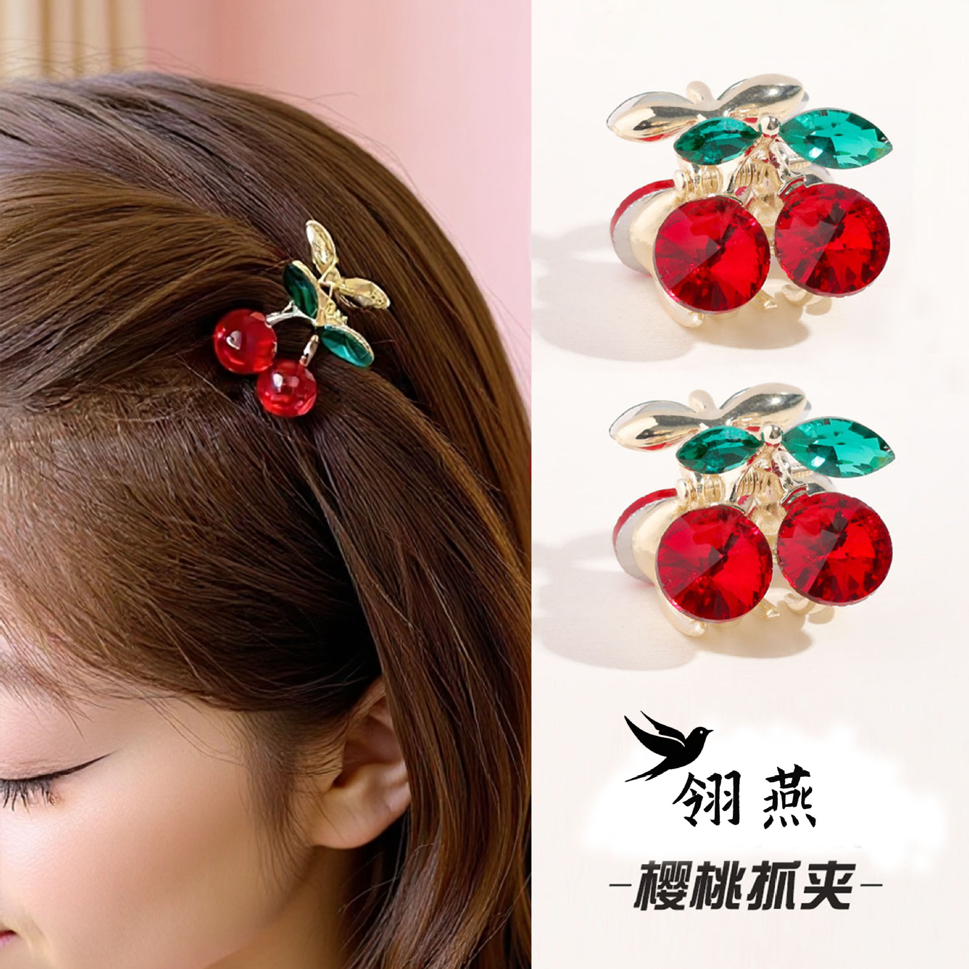 樱桃发夹女童公主气质鸭嘴夹甜美可爱风樱桃bb夹镶钻铁片刘海夹批