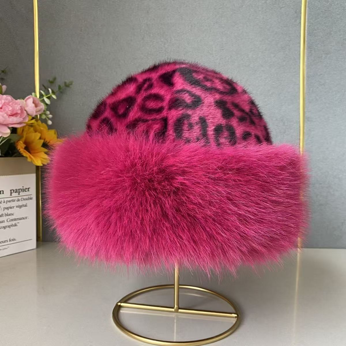 批发冬季仿皮草豹纹保暖护耳蒙古帽子女复古防寒显脸小毛绒帽子