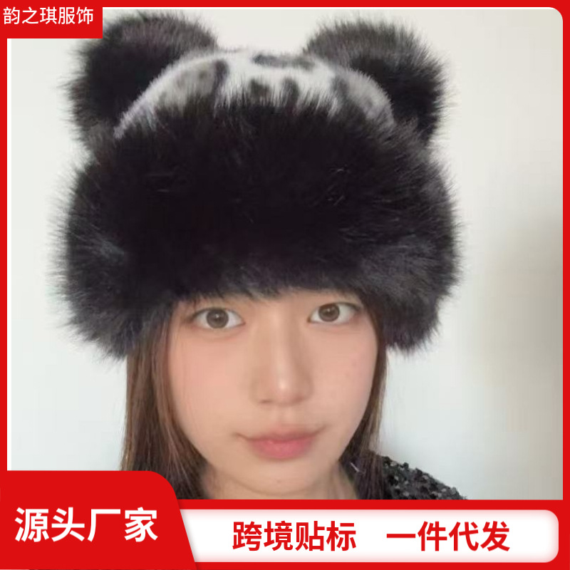 秋冬韩版仿皮草毛绒帽子小熊耳朵米奇款加厚保暖护耳豹纹蒙古帽子