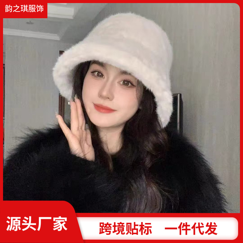毛绒帽子女秋冬仿兔毛渔夫帽大头围韩系百搭水桶帽显脸小保暖盆帽