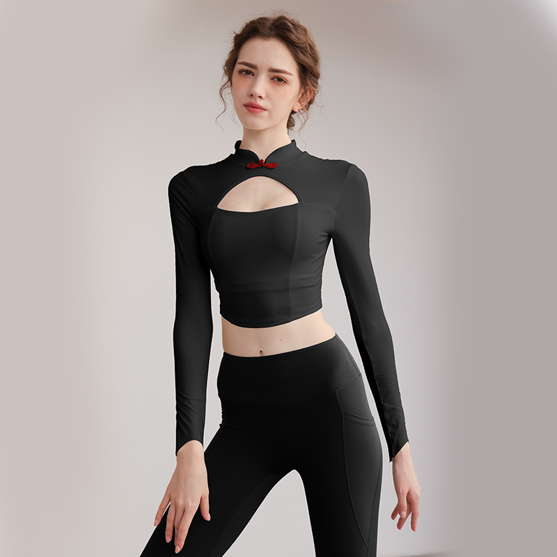 秋冬中式国风瑜伽服带胸垫紧身长袖上衣速干跑步健身服普拉提上衣