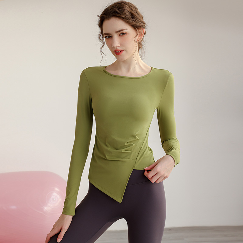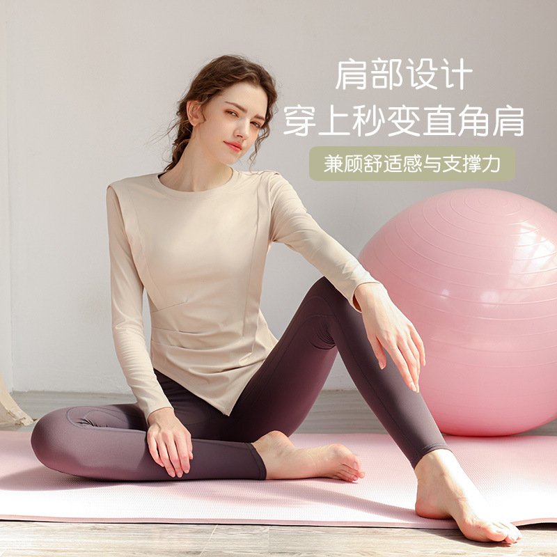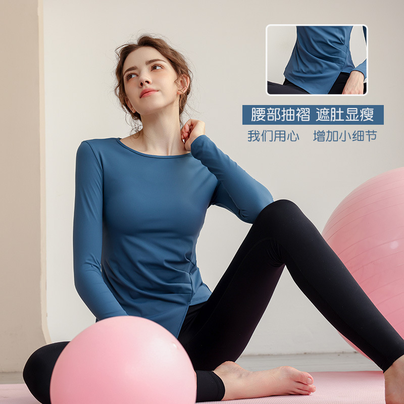 欧美圆领长袖瑜伽上衣腰部抽褶遮肉设计高弹修身运动训练瑜伽服