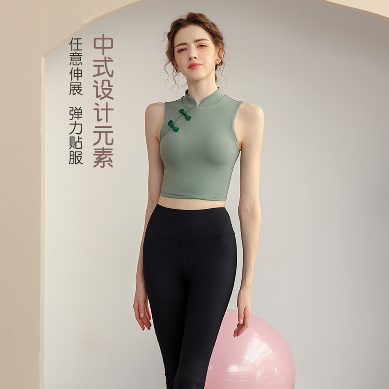 中式瑜伽服国风立领无袖背心女带胸垫外穿紧身运动健身速干运动服