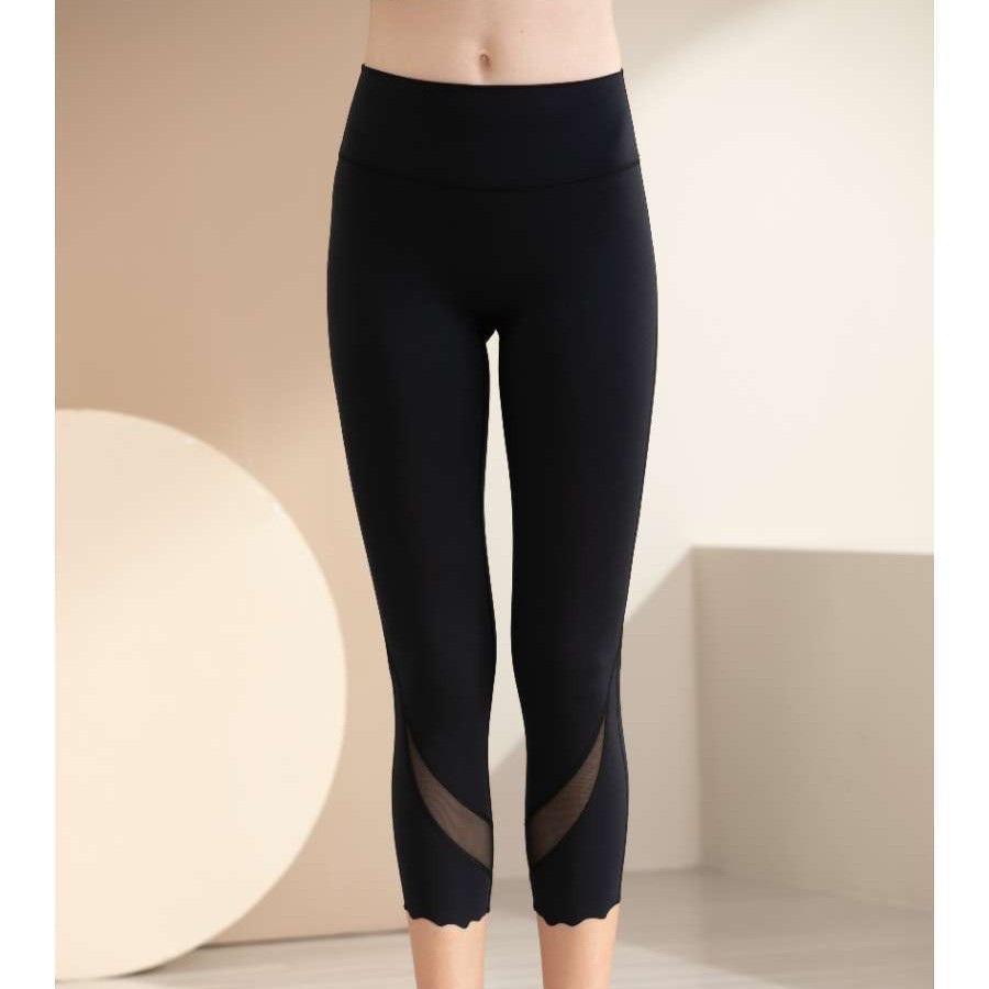 欧美高腰瑜伽裤网纱拼接七分裤运动健身紧身裤高弹网孔透气健身裤
