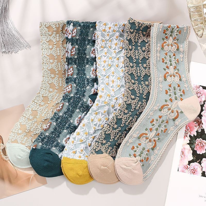 秋冬袜子女士时尚复古碎花中筒宫廷风立体新款女袜文艺森系长筒袜