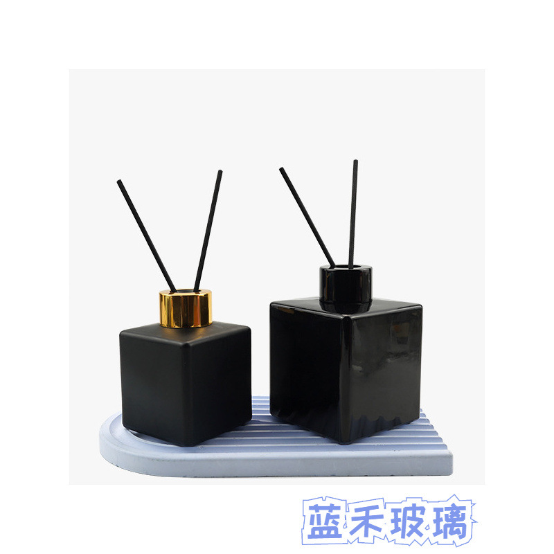 四方形磨砂亮黑色50ml100ml200ml玻璃香薰瓶藤条无火扩香喷色带盖