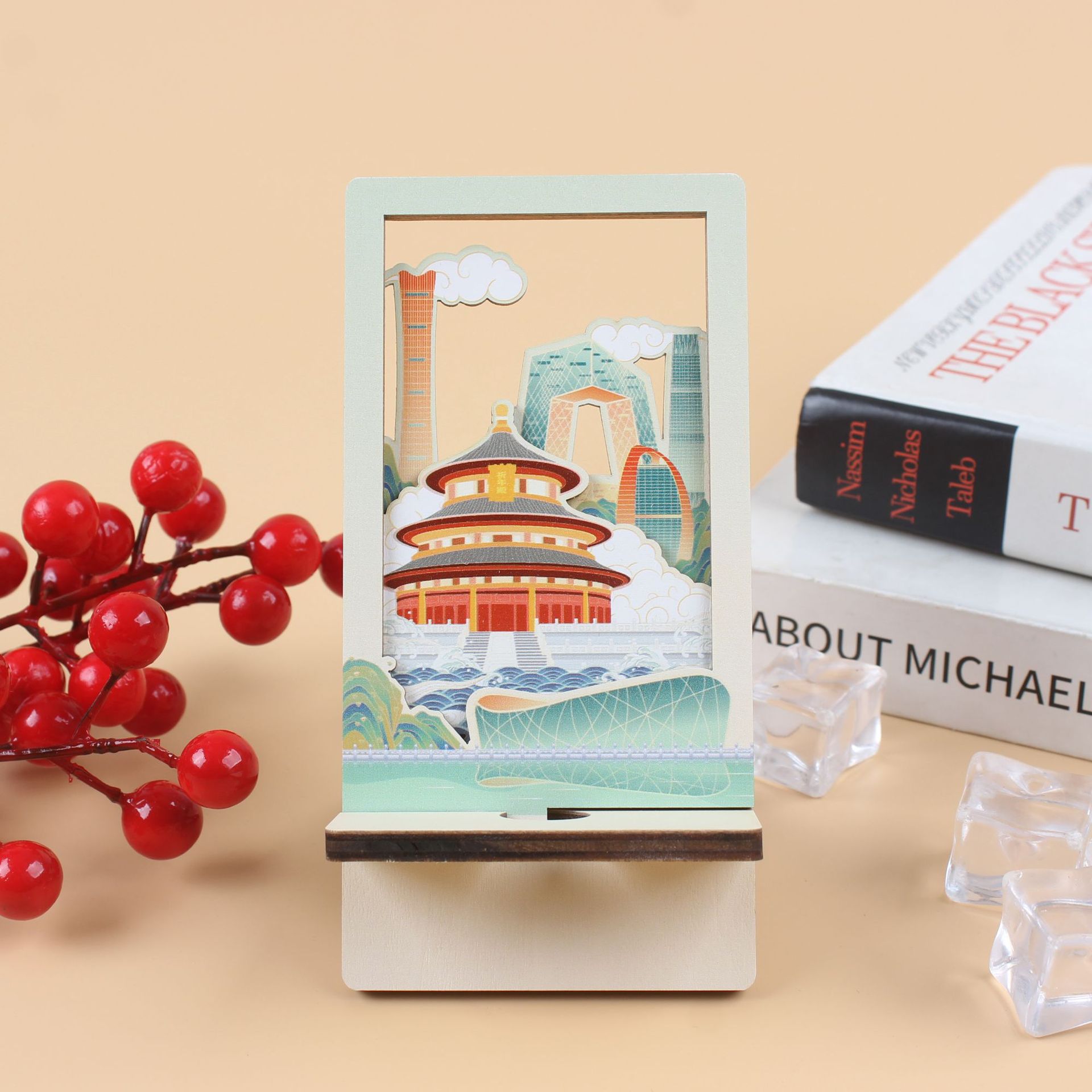 跨境亚马逊国潮木质手机支架创意城市印象3D立体多层组合手机支架
