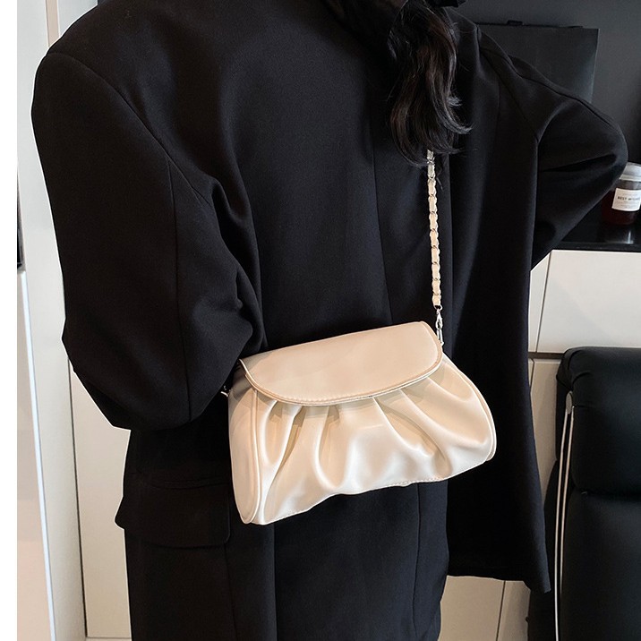时尚女生包包女2025秋新款纯色褶皱手提包可爱简约链条单肩斜跨包