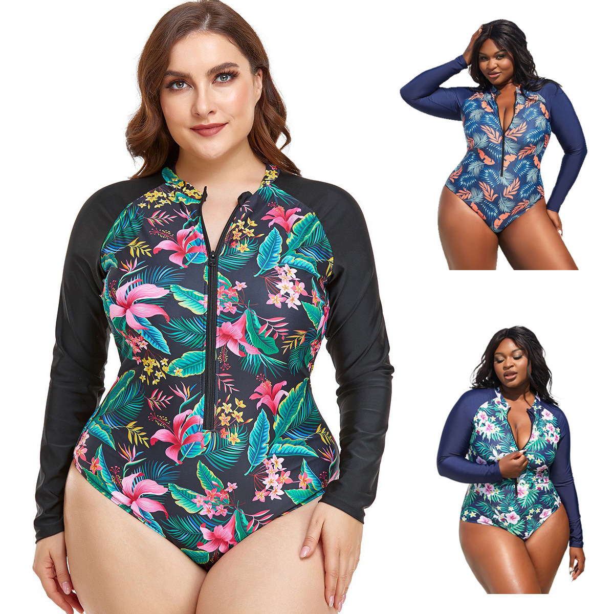 2025跨境新款欧美冲浪服大码泳装长袖防晒遮肚拉链连体泳衣女现货