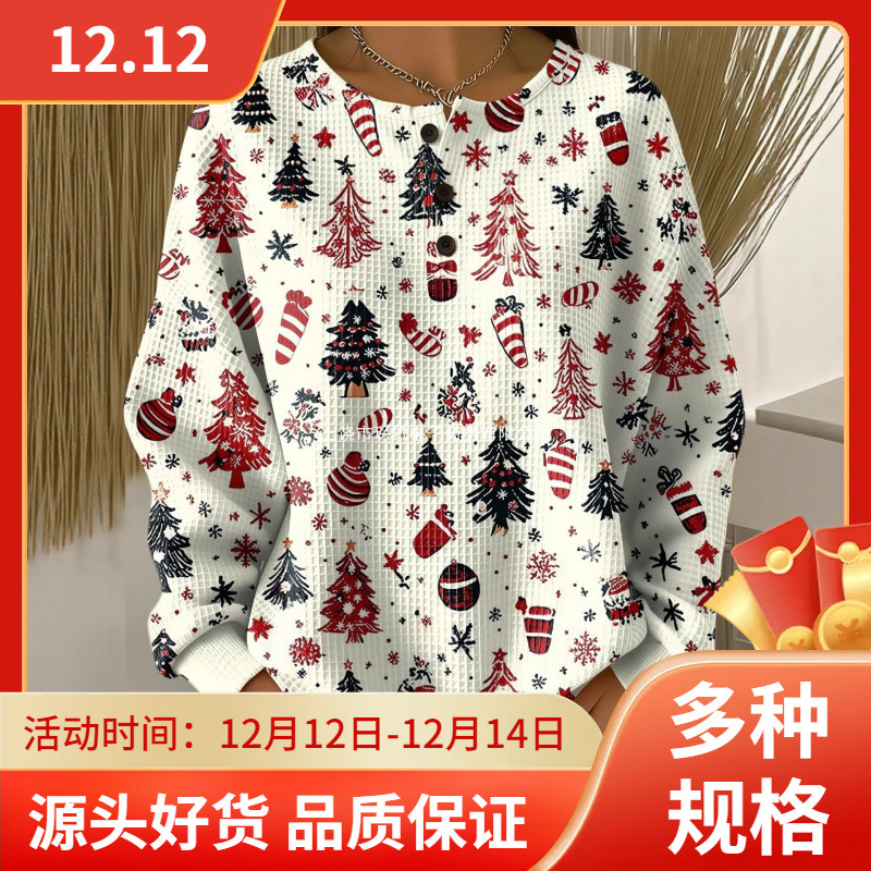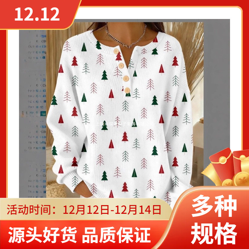 外贸亚马逊独立站新款复古数码印花四扣圆领长袖女装秋冬季