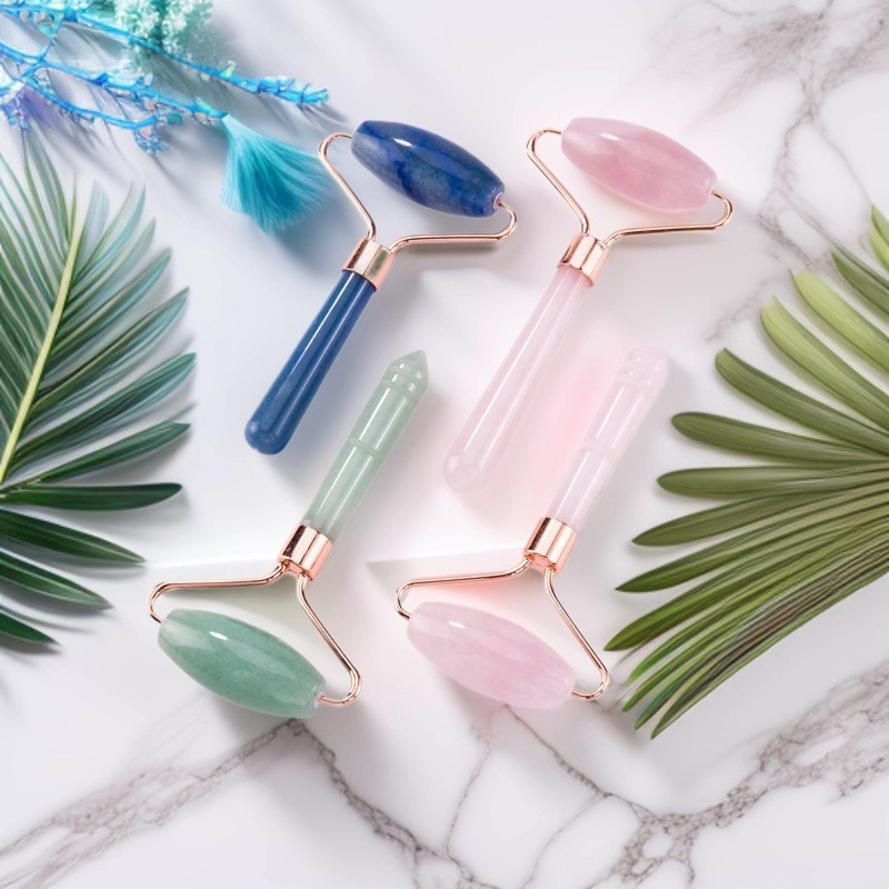 双头玉石粉晶滚轮刮板脸部美容棒石英石玉石按摩器Roller Gua Sha