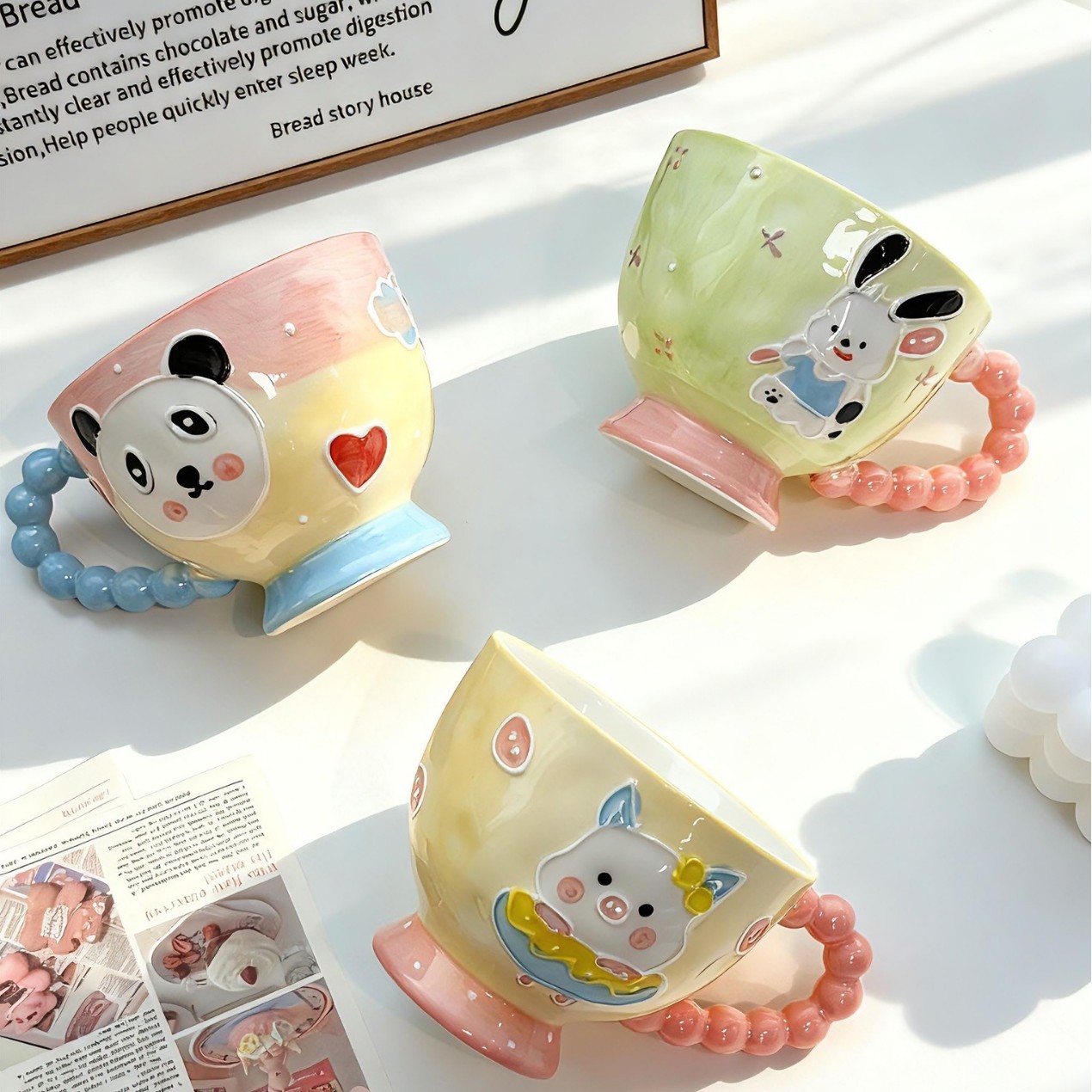 手绘浮雕卡通陶瓷马克杯可爱早餐杯家用水杯大容量燕麦杯子批发