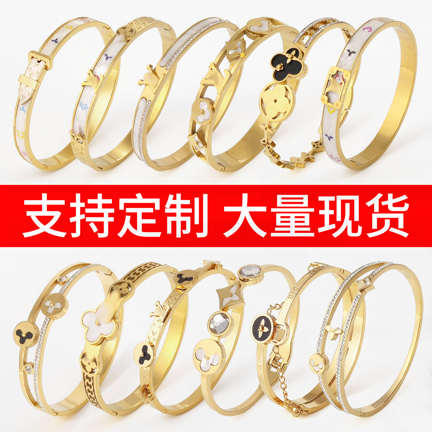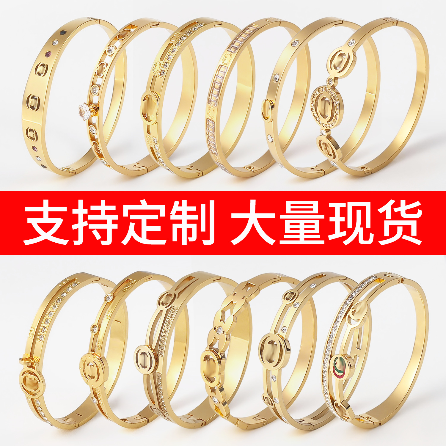 欧美跨境驴家钛钢手镯不掉色饰品镶钻泥巴钻18k金手环手饰首饰