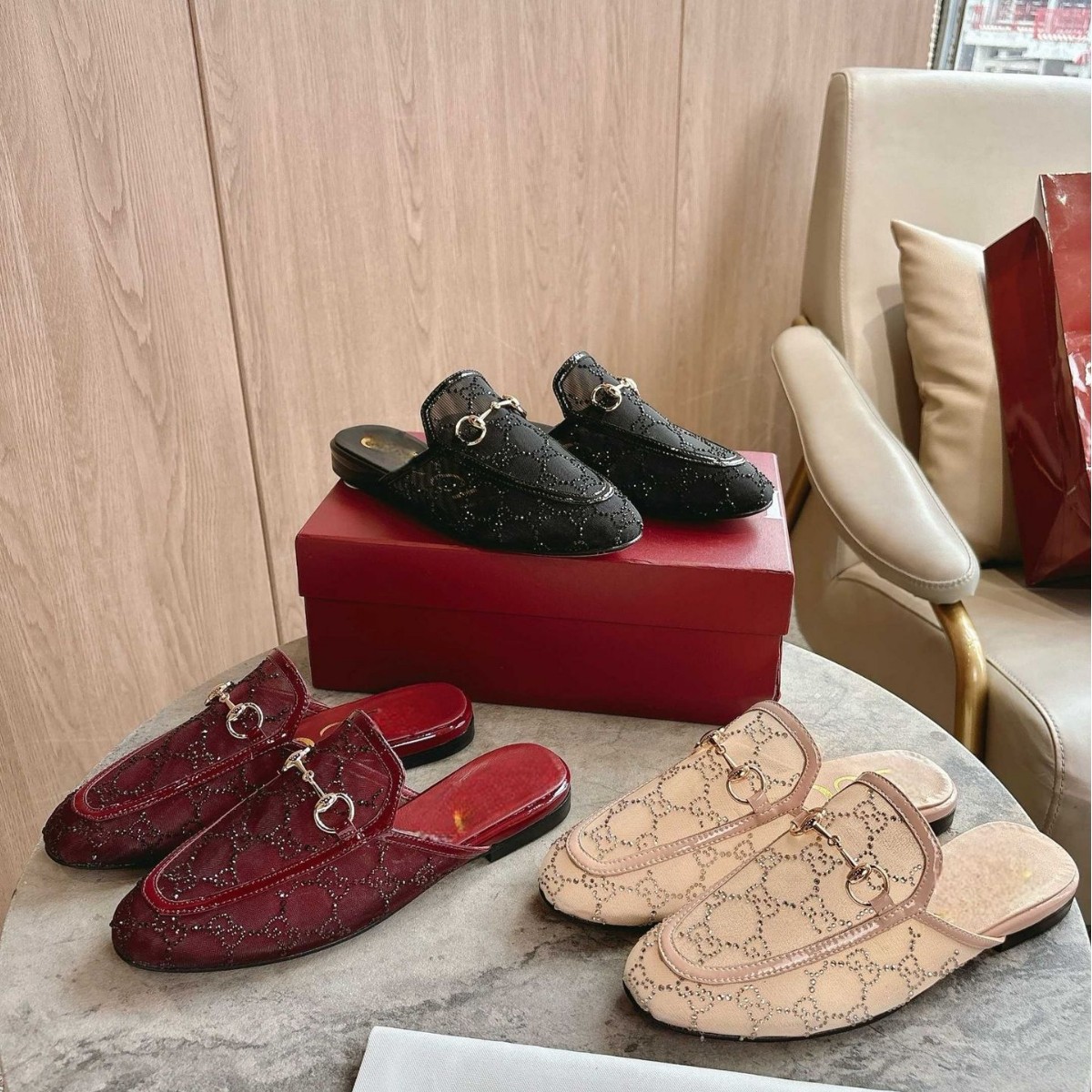 25夏季G家芭蕾舞鞋水钻马衔扣猪鼻子蝴蝶结平底大码真皮半拖低帮