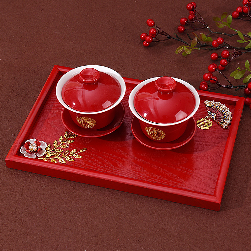 原创木质立体花托盘结婚敬酒敬茶盘子改口敬茶木纹茶盘婚礼用品