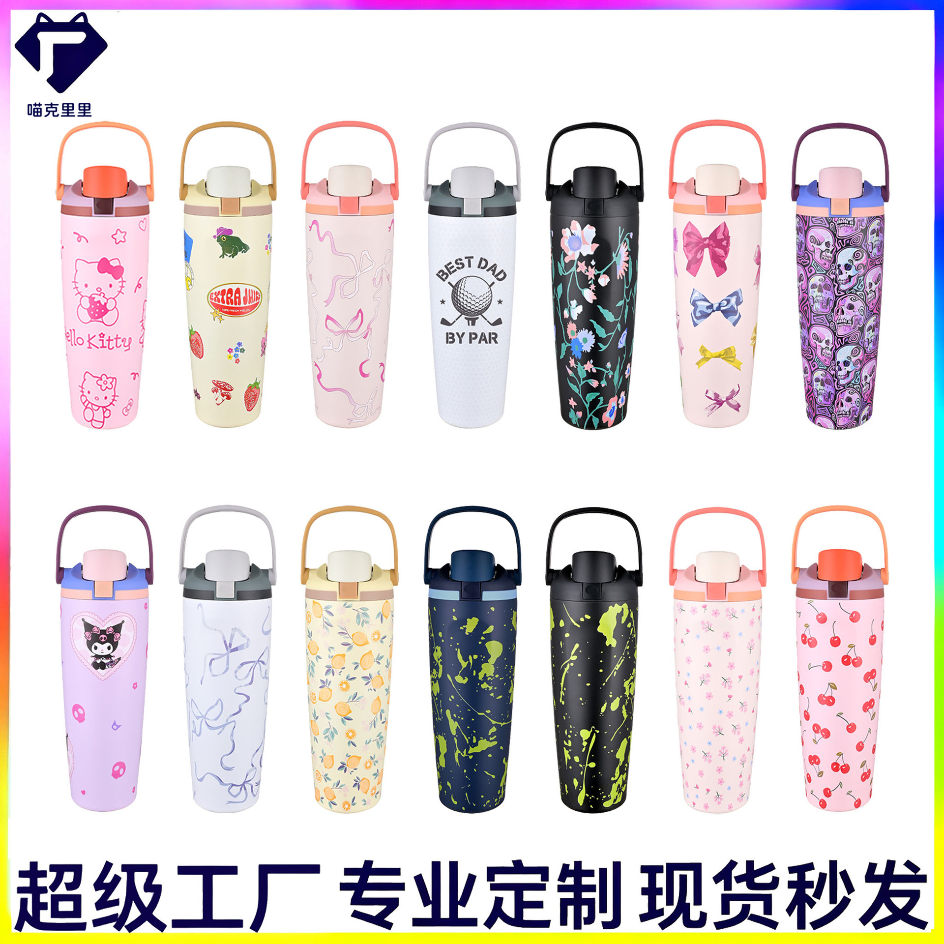 新款现货3D定制图案手提水果杯30oz大容量uv水壶304不锈钢保温杯
