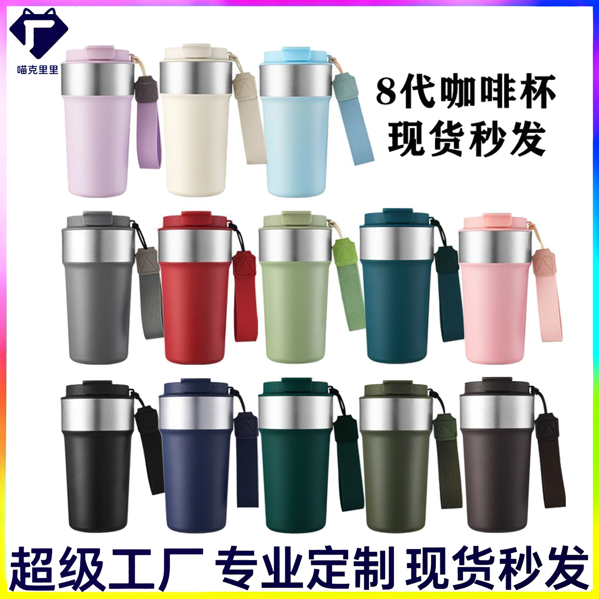 现货新款304不锈钢8代咖啡杯车载汽车杯手提带提绳便携吸管保温杯