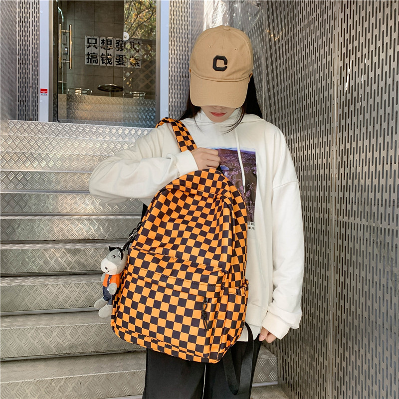 新款简约超轻黑白棋盘格帆布包女大容量双肩背包中小学生书包批发