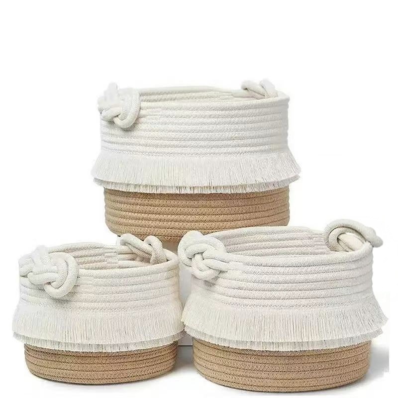 跨境棉线编织收纳筐带流苏收纳篮子整理玩具零食杂物储物盒三件套