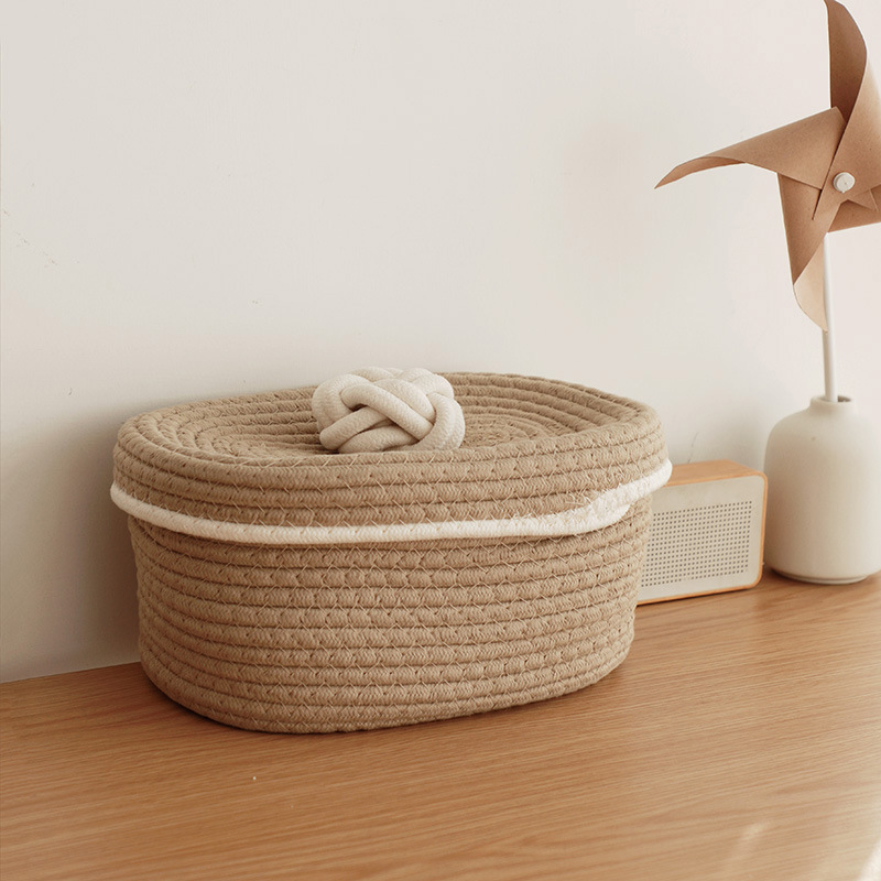桌面收纳筐带盖防尘简约收纳盒棉线手工编织客厅杂物化妆品储物筐