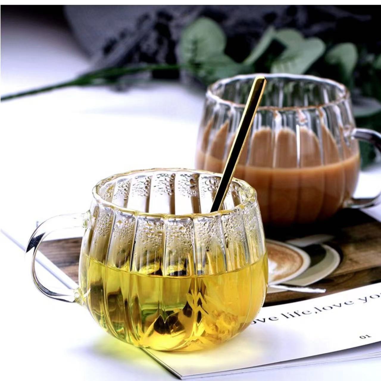 • 批发创意办公室咖啡杯 高颜值带把牛奶早餐杯 透明竖纹南瓜玻璃杯