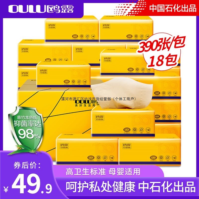 鸥露竹浆纸390张整箱家用实惠装欧露抽纸软抽本色纸巾经济装18包