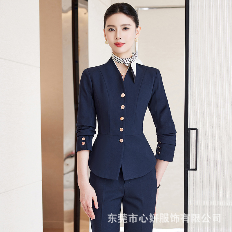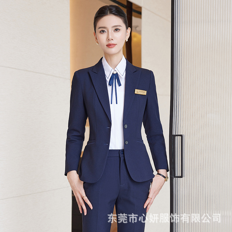 蓝色收腰职业西装女秋冬新款酒店前台接待工装商务职业通勤西装