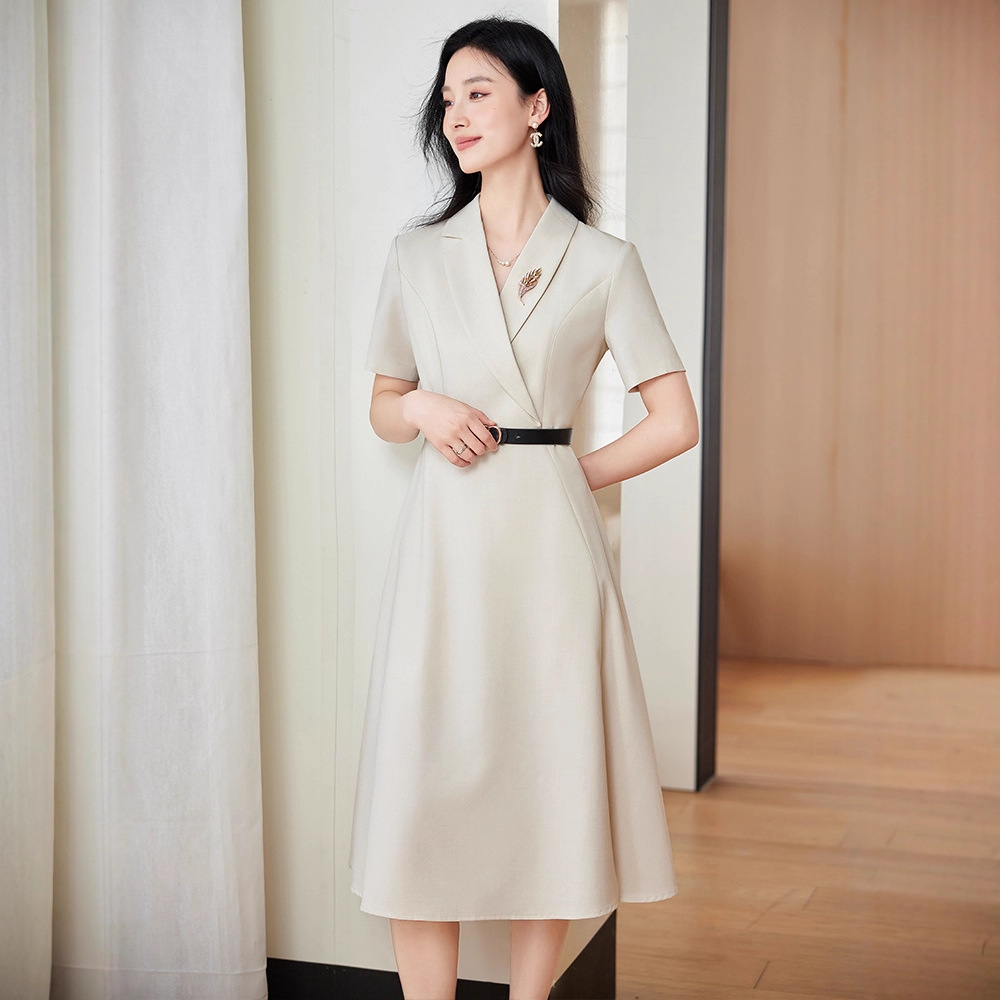 杏色短袖西装连衣裙女夏季新款通勤收腰职业通勤裙子美容院工装