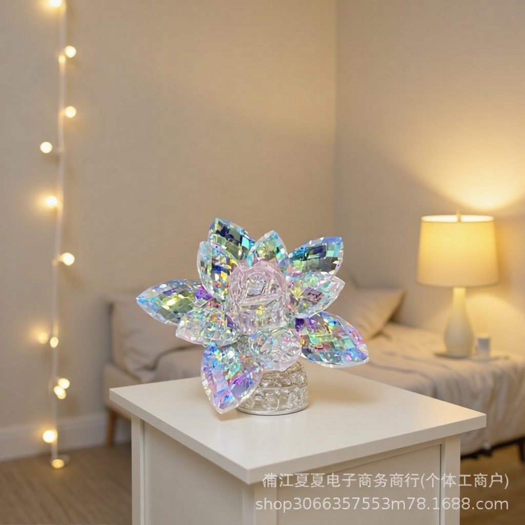 水晶石莲花装饰-自发光白水晶虹彩折射花卉中心摆件无需额外灯光