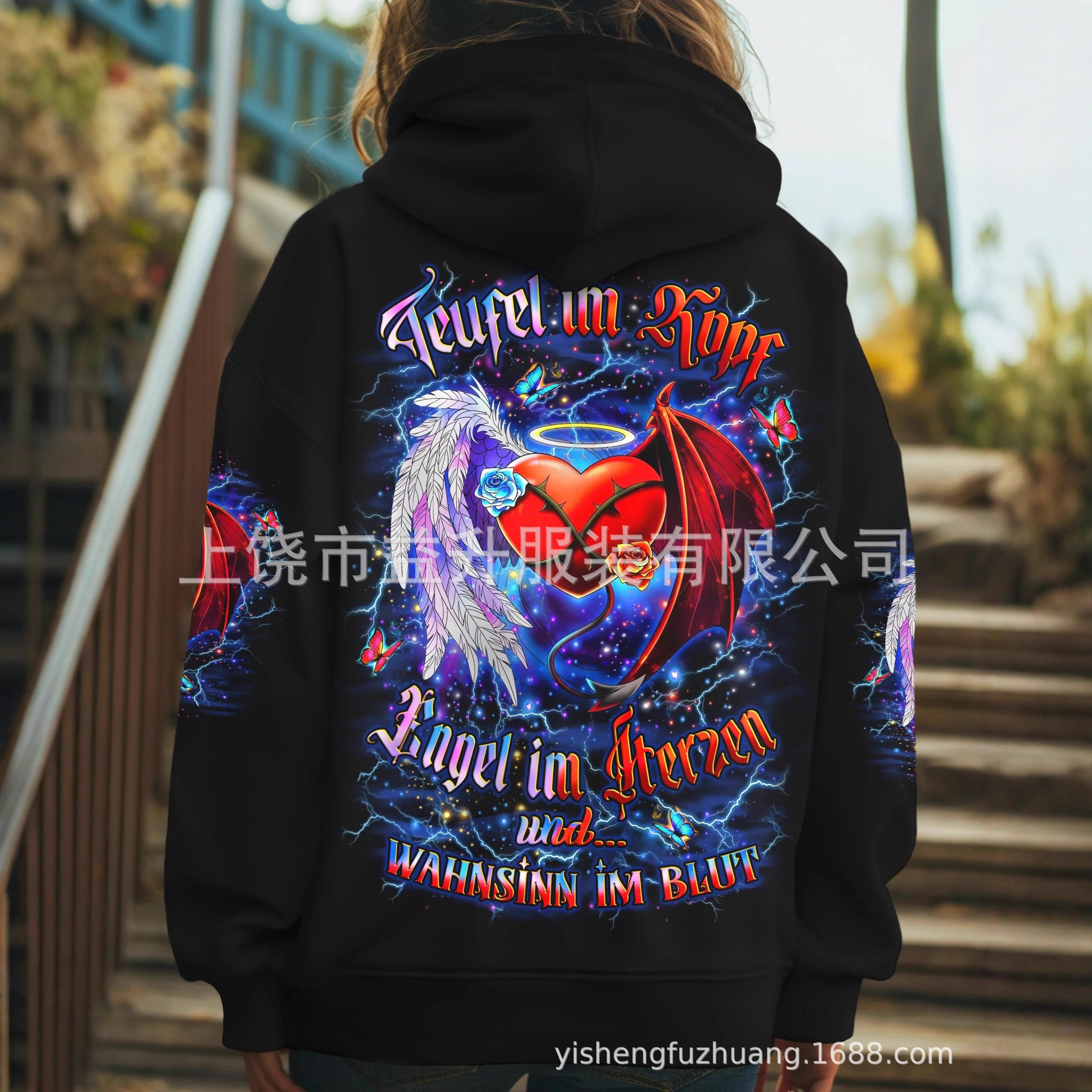 女士连帽卫衣源头厂家 跨境电商来图制作 3D印花时尚休闲连帽卫衣
