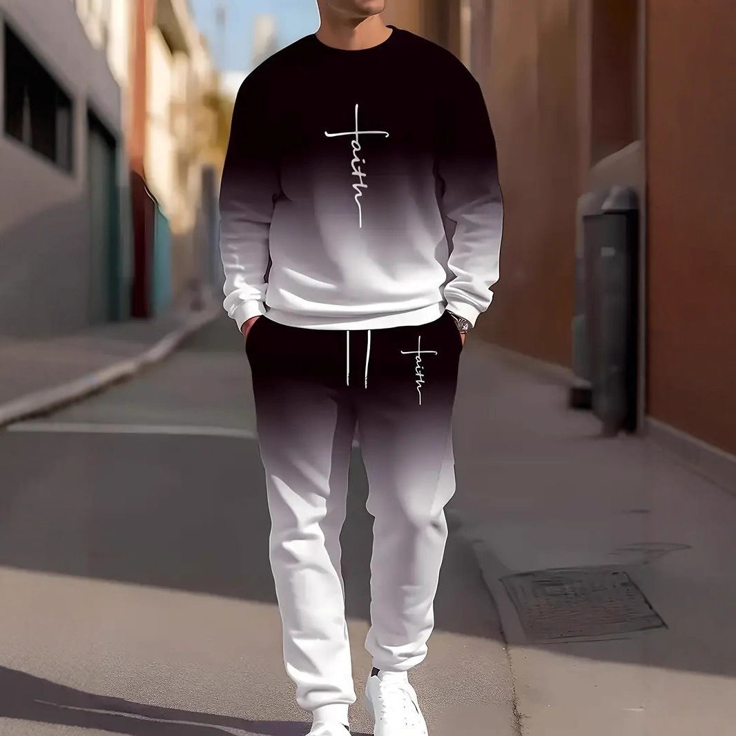 跨境新品秋冬男士休闲字母渐变色圆领卫衣套装时尚运动套装男