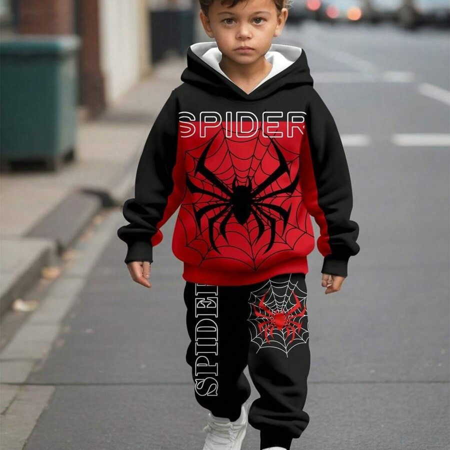 2024男童欧版休闲两件套3d印花蜘蛛侠图案儿童连帽卫衣长裤套装
