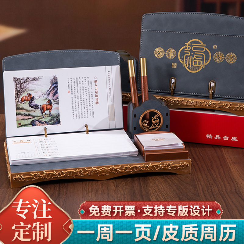 2026多功能皮质木质周历定制批发商务笔筒台座公司年会伴手礼订制