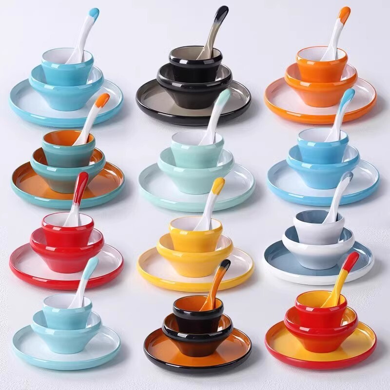 双色仿瓷碗碟杯套装餐厅饭店酒店火锅摆台四件套餐具密胺商用耐摔