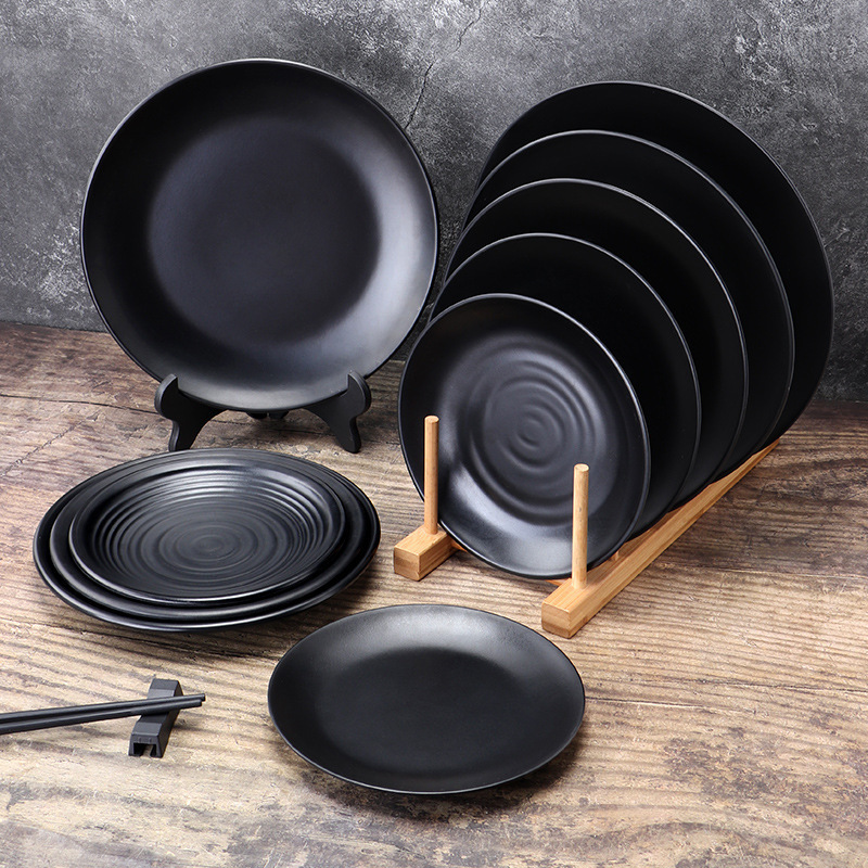 密胺黑色磨砂圆盘火锅烧烤餐厅炒菜盘骨碟仿瓷餐具配菜盘商用平盘