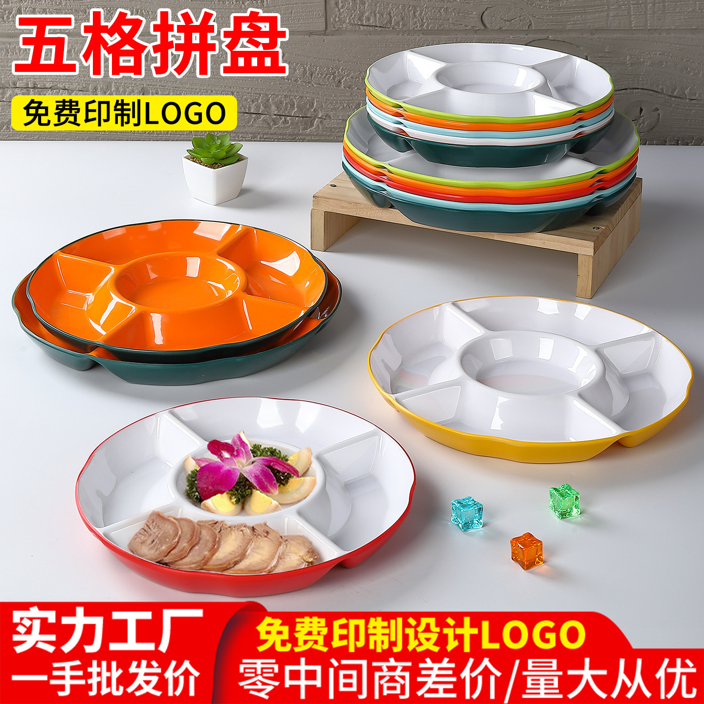 小吃拼盘餐具密胺盘子五格卤水摆盘仿瓷分格菜盘水果盘塑料小吃盘