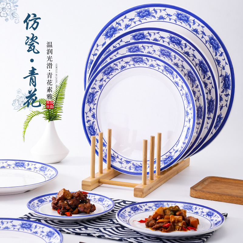 青花瓷密胺盘子塑料浅圆盘平盘仿瓷餐具餐厅饭店炒菜碟子菜盘商用