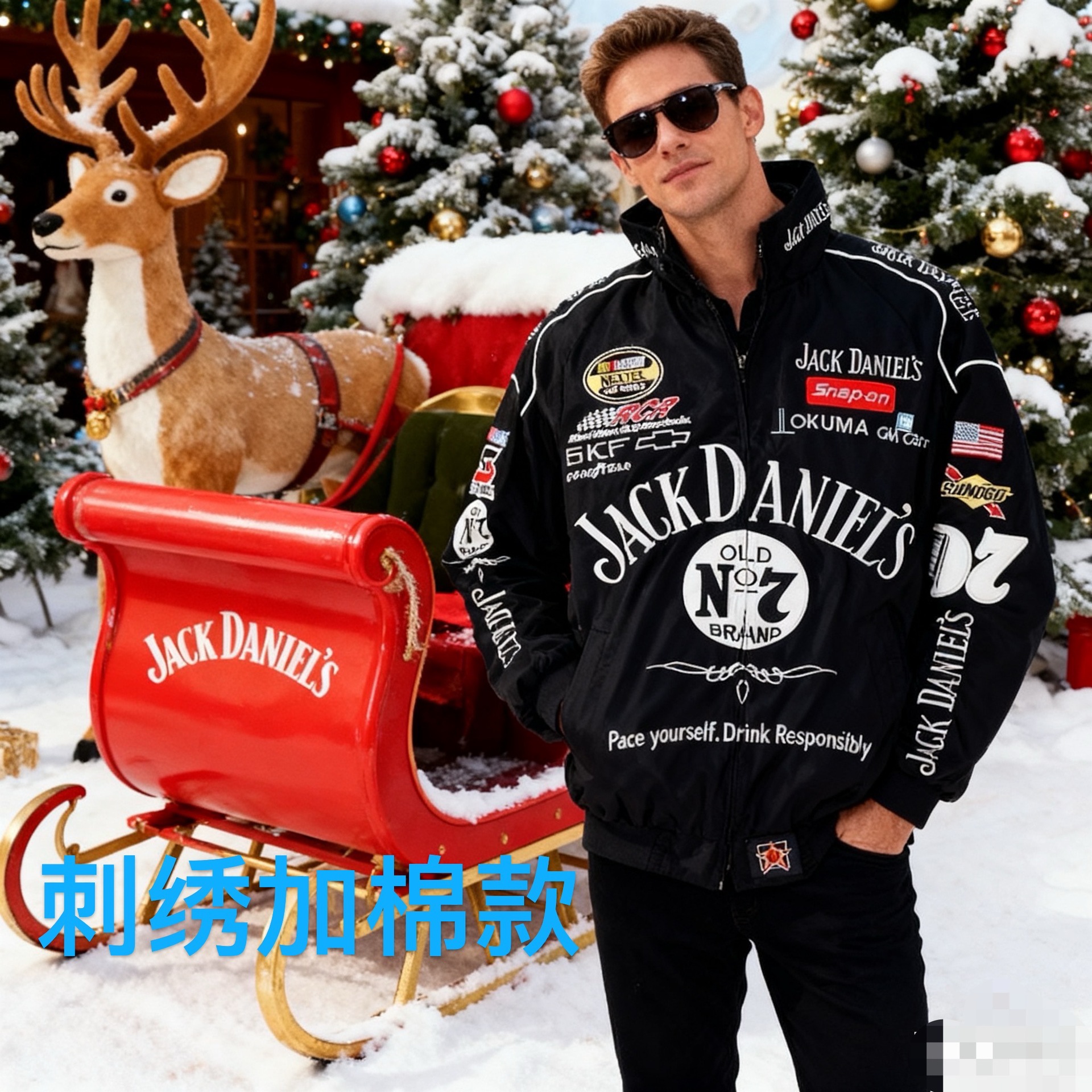 复古F1刺绣赛车夹克长袖冬装棉服刺绣加棉厚款棉服外套红牛定制款