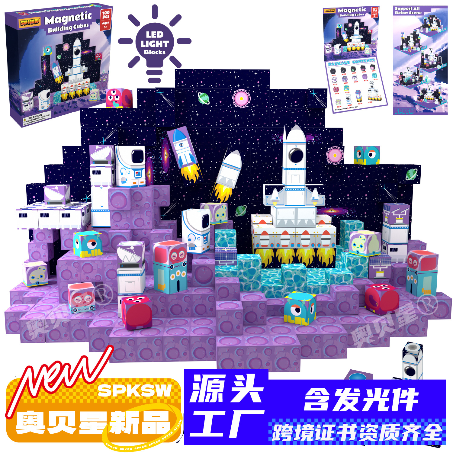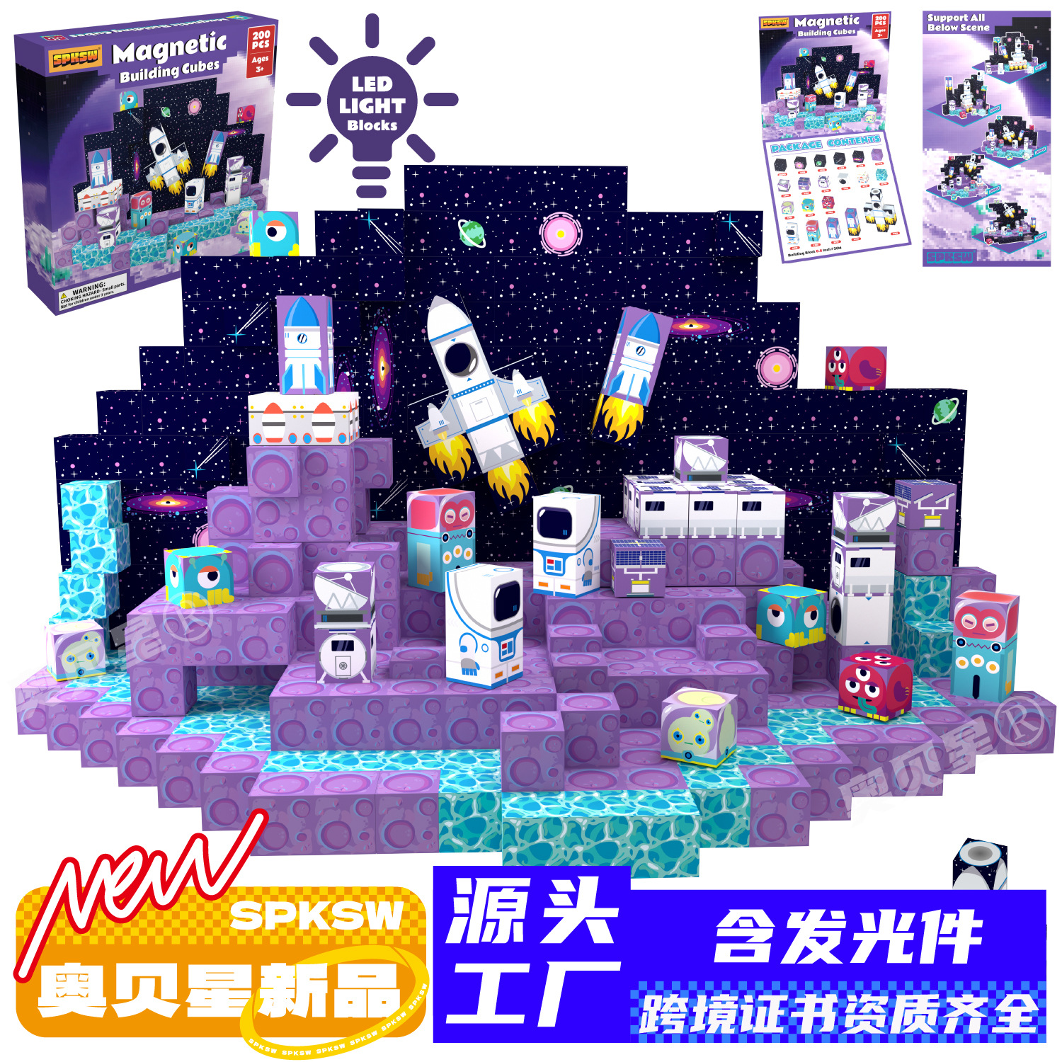 跨境MC新款太空宇航员火箭玩具磁吸积木磁力方块积木磁力片批发