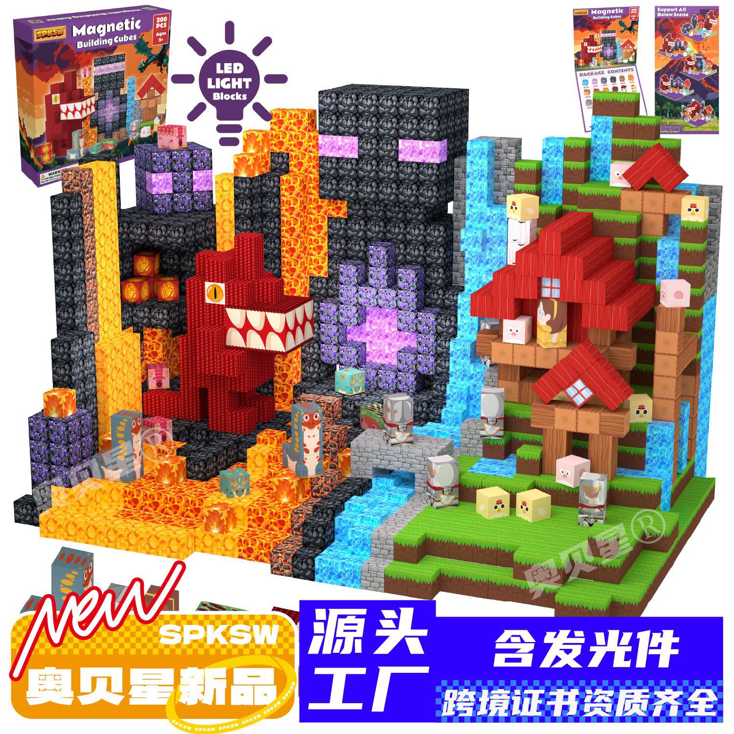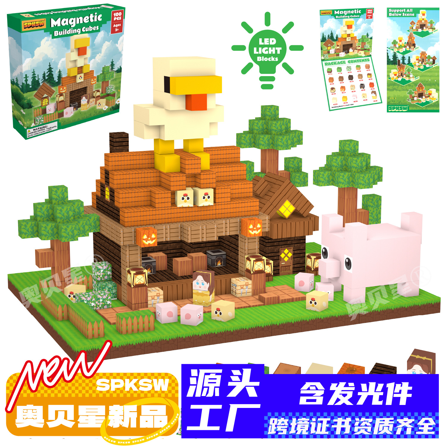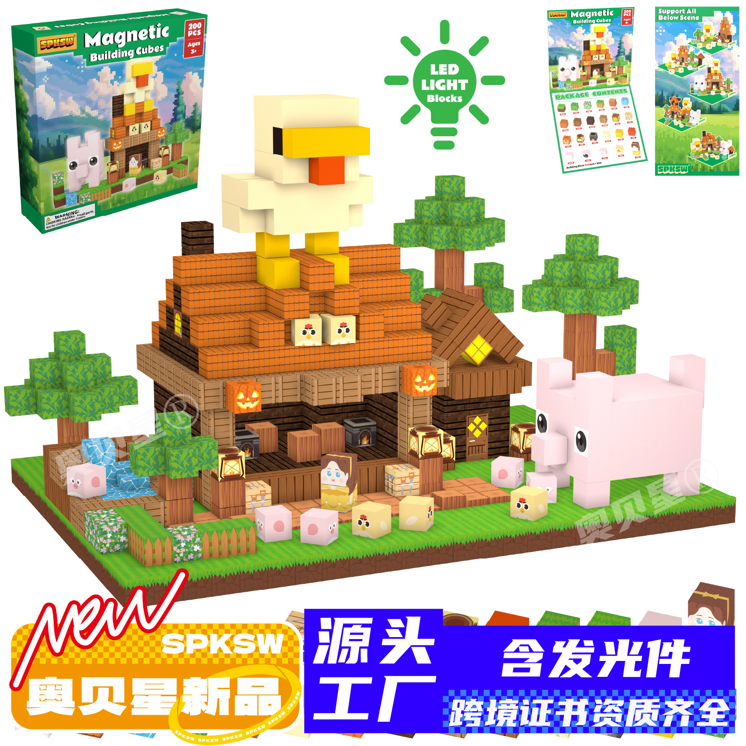 跨境亚马逊新爆款我的农场世界磁力方块积木蒙特利梭灯光玩具套装