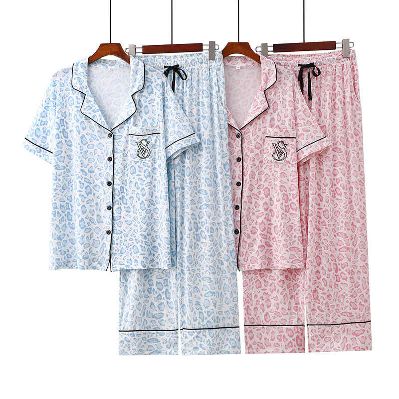 2025跨境外贸豹纹牛奶丝印花开衫翻领短袖长裤女士薄款家居服睡衣