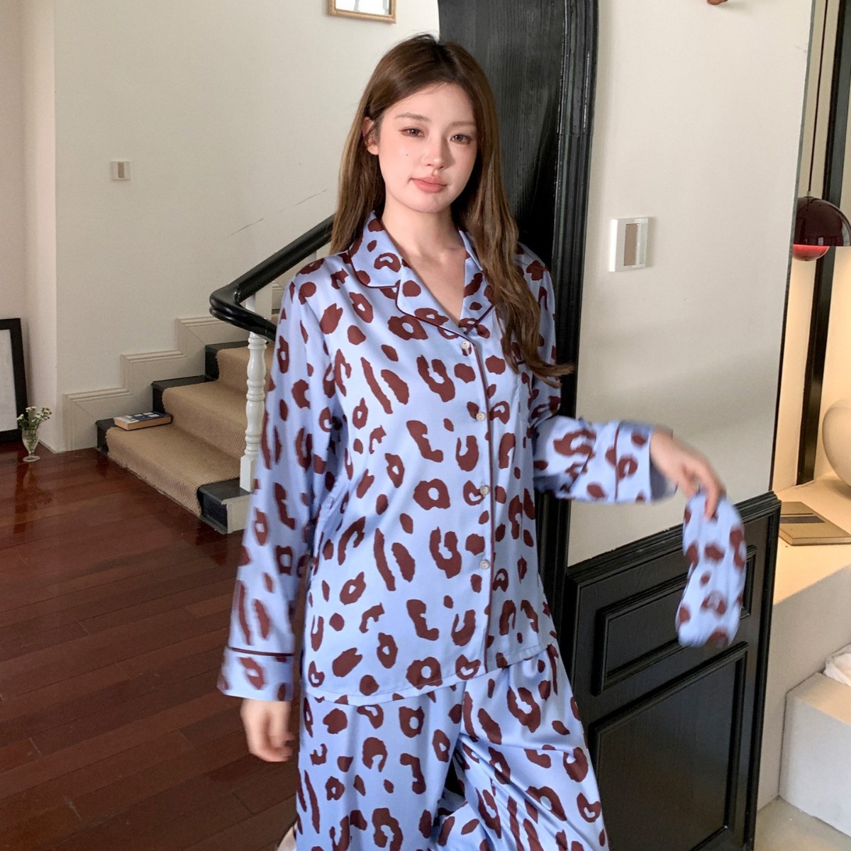 跨境法式蓝色豹纹冰丝睡衣女春秋新长袖长裤家居服套装小红书同款